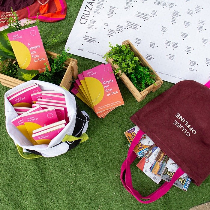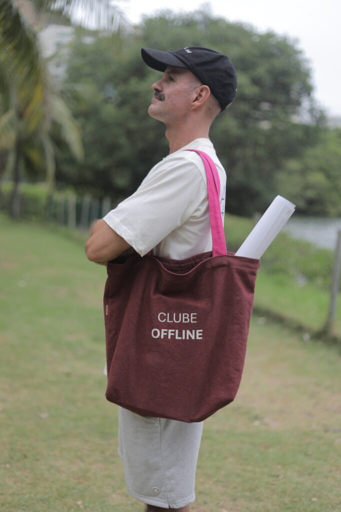 Nos acessórios, a coleção expande essa mensagem para o dia a dia. As bolsas em formato tote trazem inscrições como “Clube Offline” e “Desonline”, transformando o uso cotidiano em extensão do manifesto. Os bonés seguem a mesma linguagem, enquanto a canga “puxa conversa” propõe interações diretas, com perguntas que funcionam como gatilhos para diálogos e conexões reais.