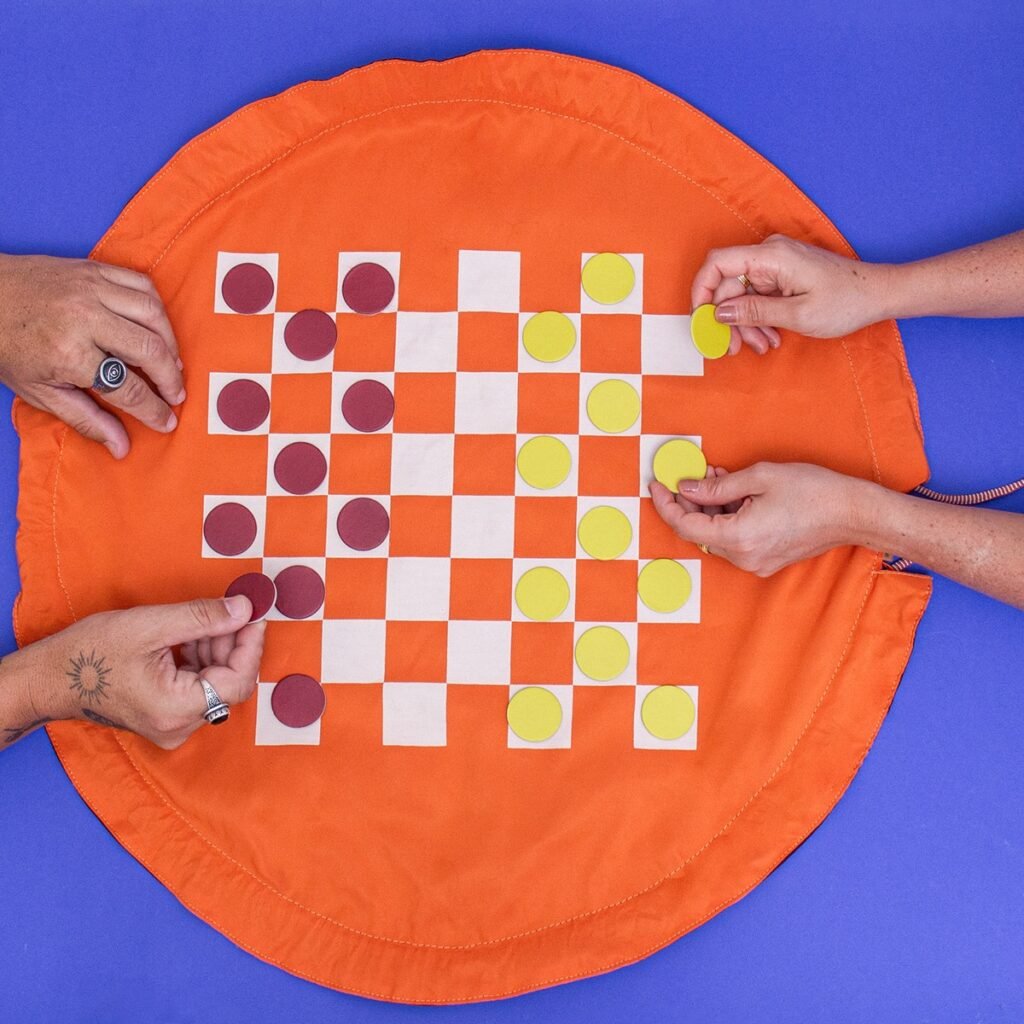 Os jogos aparecem como protagonistas desse resgate: o jogo da memória, com 25 pares e cores vibrantes, convida à atenção e ao tempo compartilhado; o dominó reinventa o clássico com uma estética gráfica contemporânea; e o jogo de damas traz um dos gestos mais interessantes da coleção — o tabuleiro é a própria bolsa, que se abre, vira espaço de jogo e depois se transforma novamente em objeto de transporte, unindo função, brincadeira e mobilidade em uma única peça .