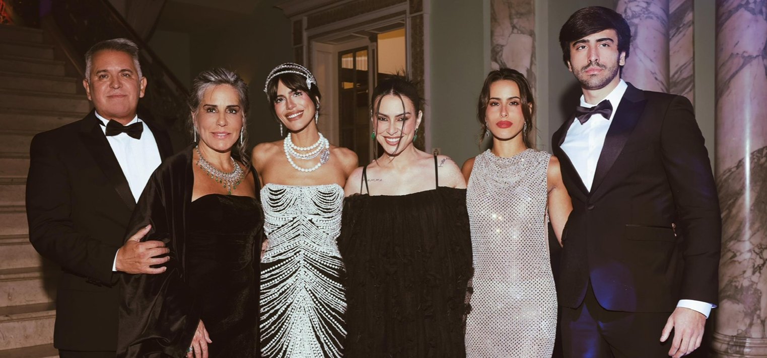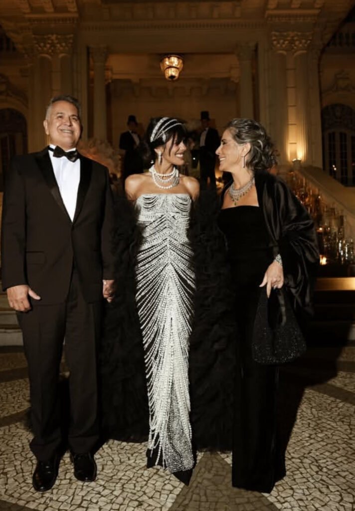 A aniversariante optou por um vestido custom made de André Betio com mais de 3 mil pérolas aplicadas e design que faz referência direta à década de 1920. Na beleza, a atriz também trouxe alusão à época com um trabalho elegante e detalhista de Leo Ferreira.