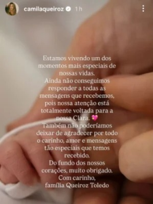 Na publicação, Camila e Klébber agradeceram as inúmeras mensagens de carinho que receberam desde o anúncio do nascimento, explicando que ainda não conseguiram responder a todas as manifestações de apoio por estarem totalmente dedicados aos cuidados com Clara. “Estamos vivendo um dos momentos mais especiais de nossas vidas. Ainda não conseguimos responder as mensagens que recebemos, pois nossa atenção está totalmente voltada à nossa Clara. Também não poderíamos deixar de agradecer por todo o carinho, amor e mensagens tão especiais que temos recebido. Do fundo dos nossos corações, muito obrigado”, escreveu o casal nos Stories do Instagram, reforçando o sentimento de gratidão e união familiar.
