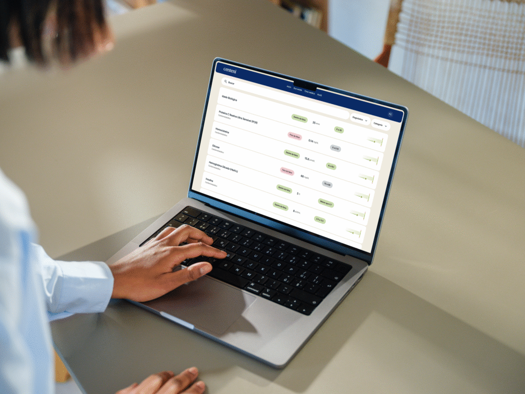 Com os resultados disponíveis, os dados passam a ser organizados em um dashboard digital que reúne e traduz informações clínicas em linguagem acessível. A ferramenta permite consolidar exames realizados em diferentes