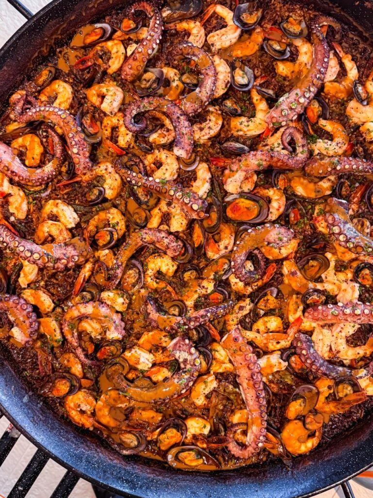 O cardápio começou com uma seleção de tapas, incluindo lula no romesco com beurre blanc e azeite de manjericão, gambás e pulpo al ajillo, prime de porco sobre musseline e jus, salada de aspargos com pata negra e água de beterraba aromatizada, shitake dourado na manteiga com demi de cebola, além de pan tumaca com jamón e jamón cortado a cuchillo. Como pratos principais, foram servidas paella de porco, paella de frutos do mar e uma versão da horta, vegana. Para finalizar, pudim e torta basca fecharam a experiência.