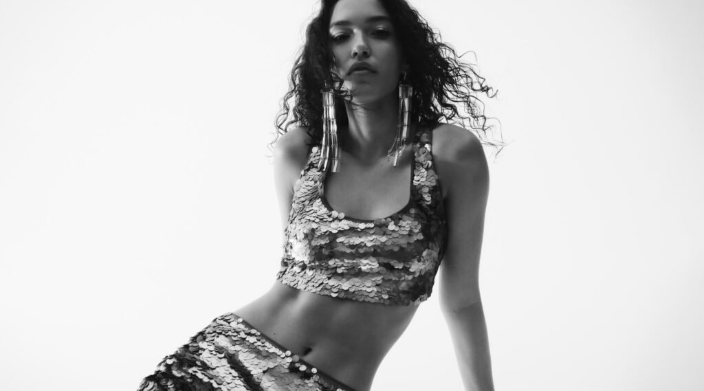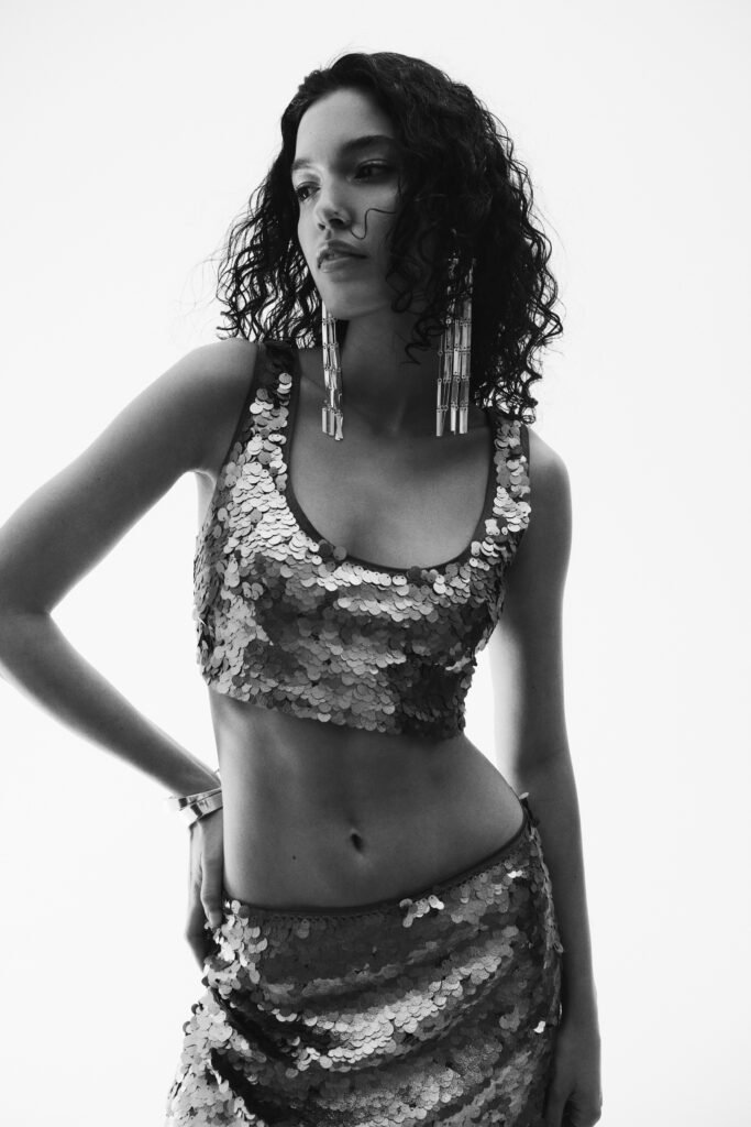 - Metalizados e brilhos: saias e tops com acabamento metalizado, ideais para criar produções