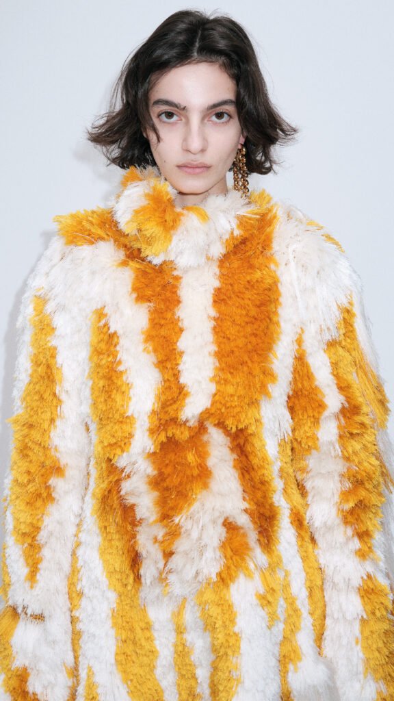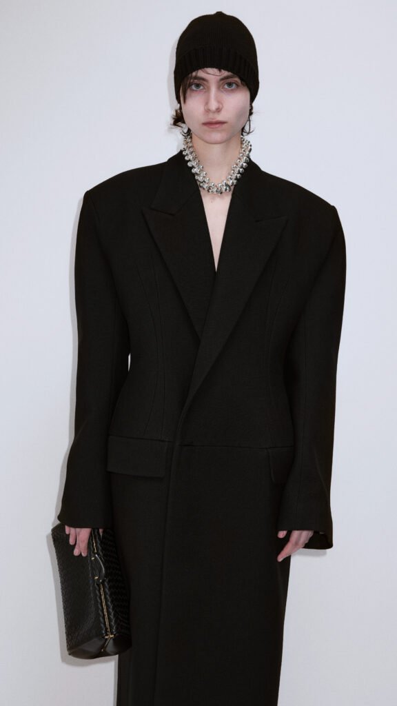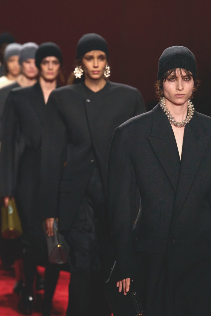 Na ópera, no teatro e no palco público da praça, os milaneses se vestem tanto para a comunidade quanto para si mesmos. Há um sentimento de orgulho em se vestir com confiança e cuidado. Uma brincadeira artesanal de pele sobre pele traz o trabalho manual da Bottega Veneta para imitar texturas de pele em sedas, fil coupé, tricô e fibras técnicas, ondulando em roupas, joias e sapatos. À medida que o refinado evolui para o operístico, há uma sugestão de Maria Callas e Pier Paolo Pasolini, sua arte radical e amor não convencional.