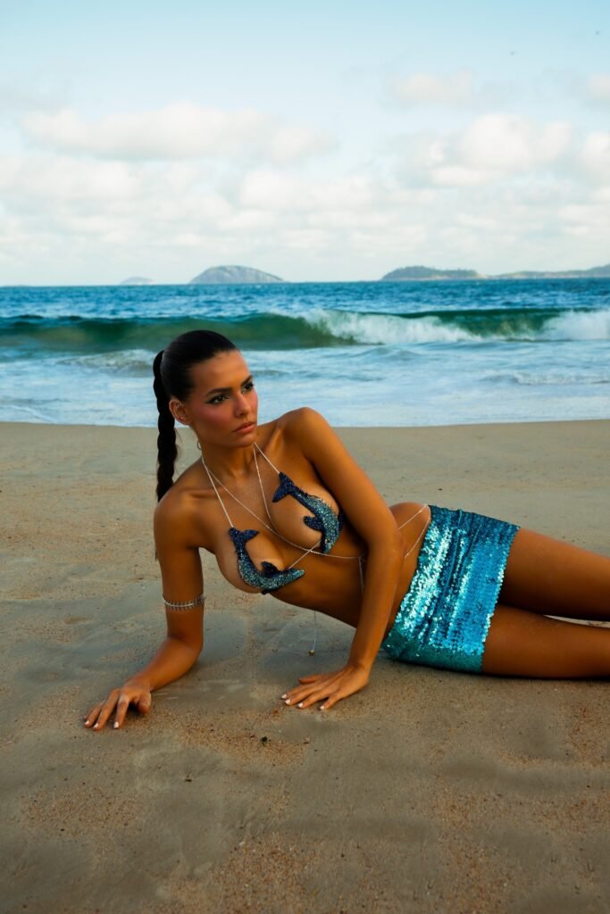 Em composições ousadas que acompanhavam peças de swimwear adaptadas para curtir a festa, a influenciadora trouxe referências da estética clássica dos foliões combinados ao high fashion de acessórios vintage.