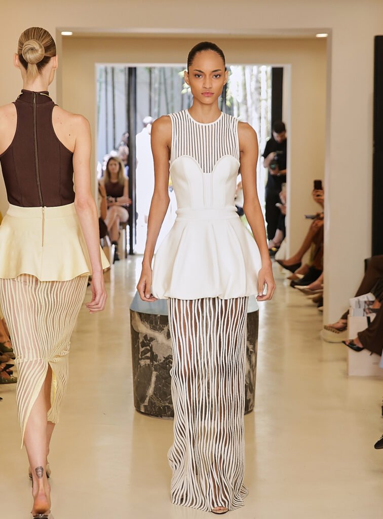 A transparência surge como aliada da sensualidade sofisticada, enquanto tecidos inovadores, como o jersey, reforçam a busca por modernidade sem abrir mão da sofisticação.