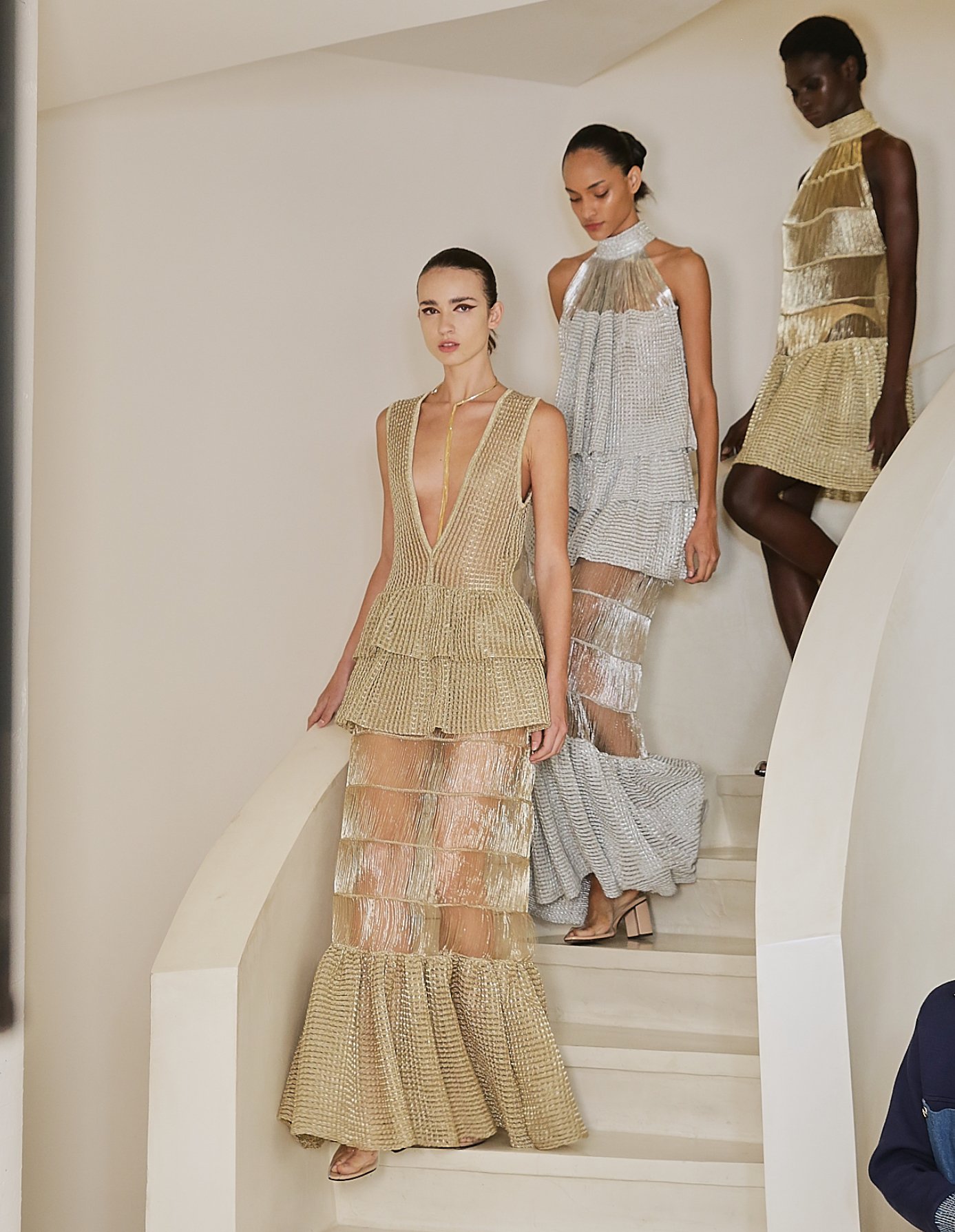 A transparência surge como aliada da sensualidade sofisticada, enquanto tecidos inovadores, como o jersey, reforçam a busca por modernidade sem abrir mão da sofisticação.
