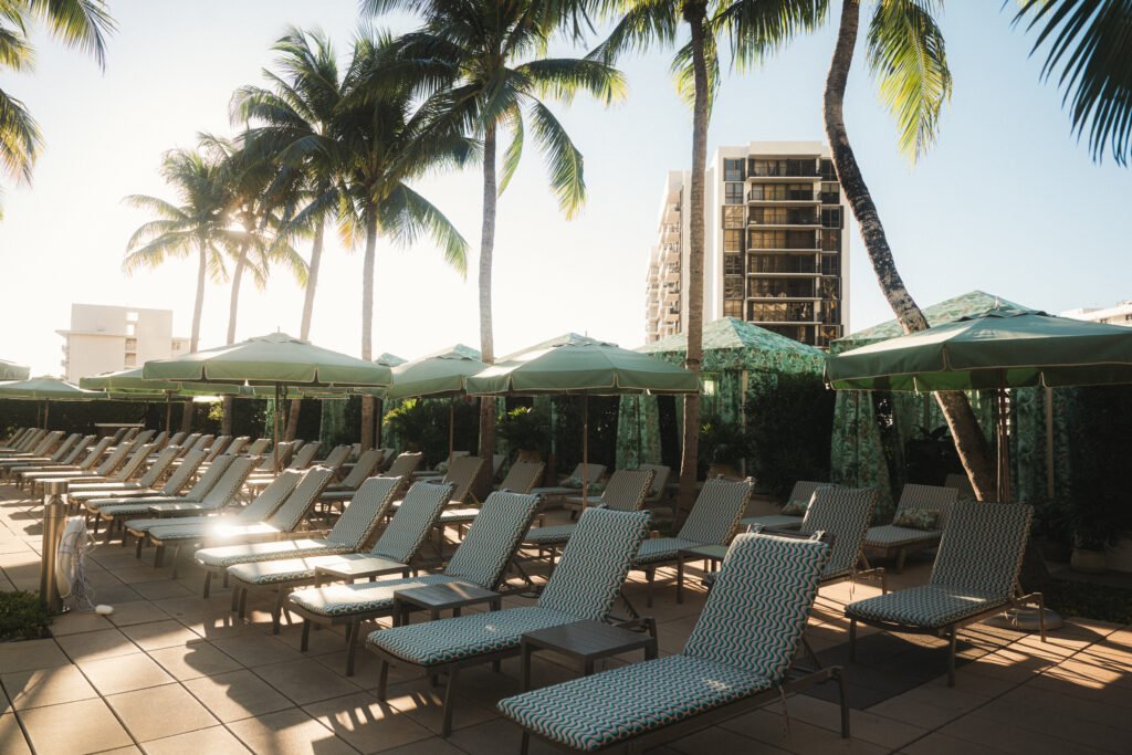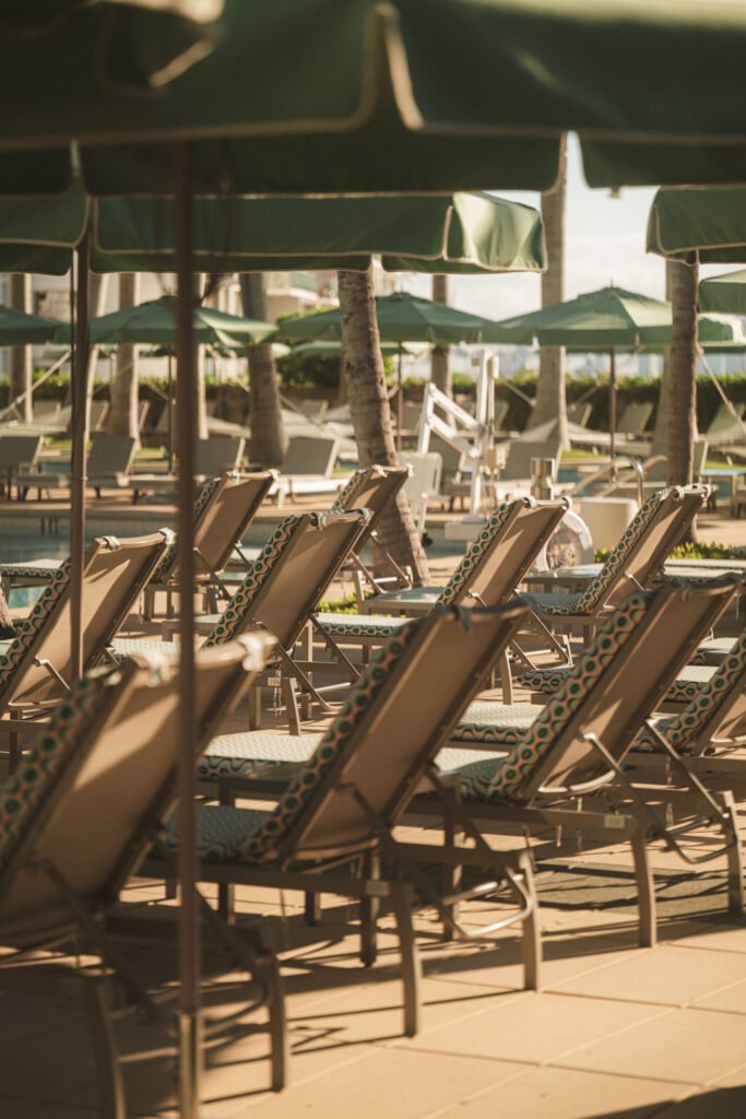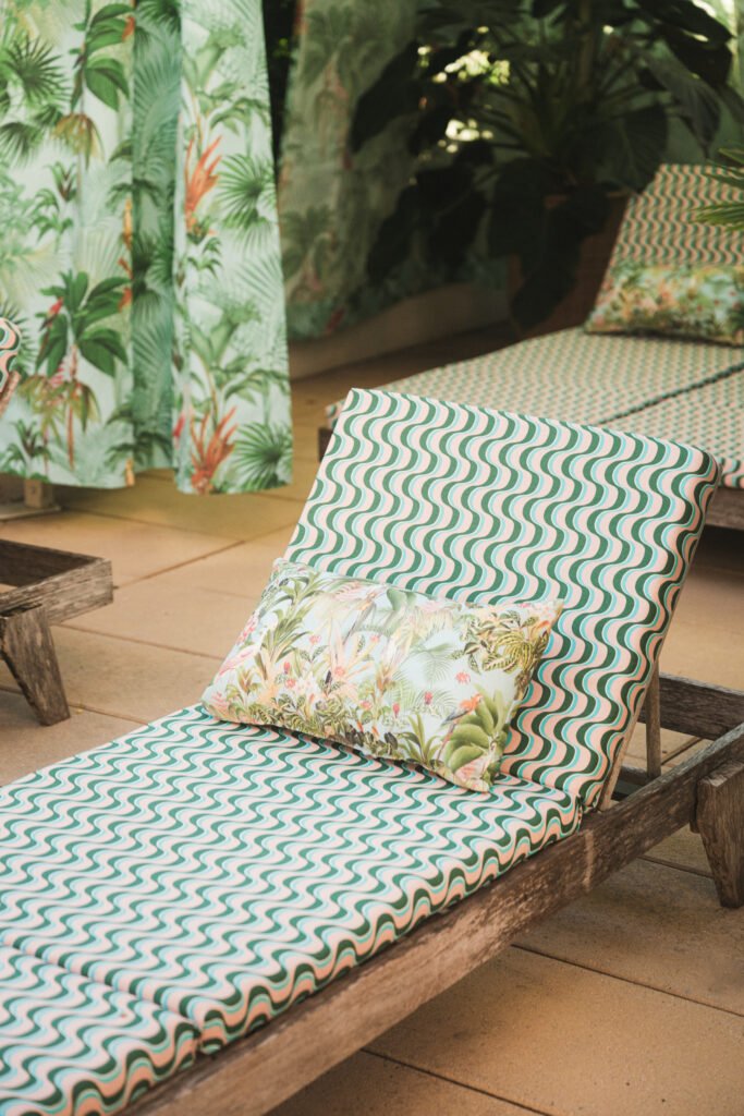 mergulhar em um verão eterno. Essa estampa inédita foi aplicada em móveis e itens de décor como ombrelones, almofadas e espreguiçadeiras, criando uma atmosfera solar e refinada à beira da piscina.