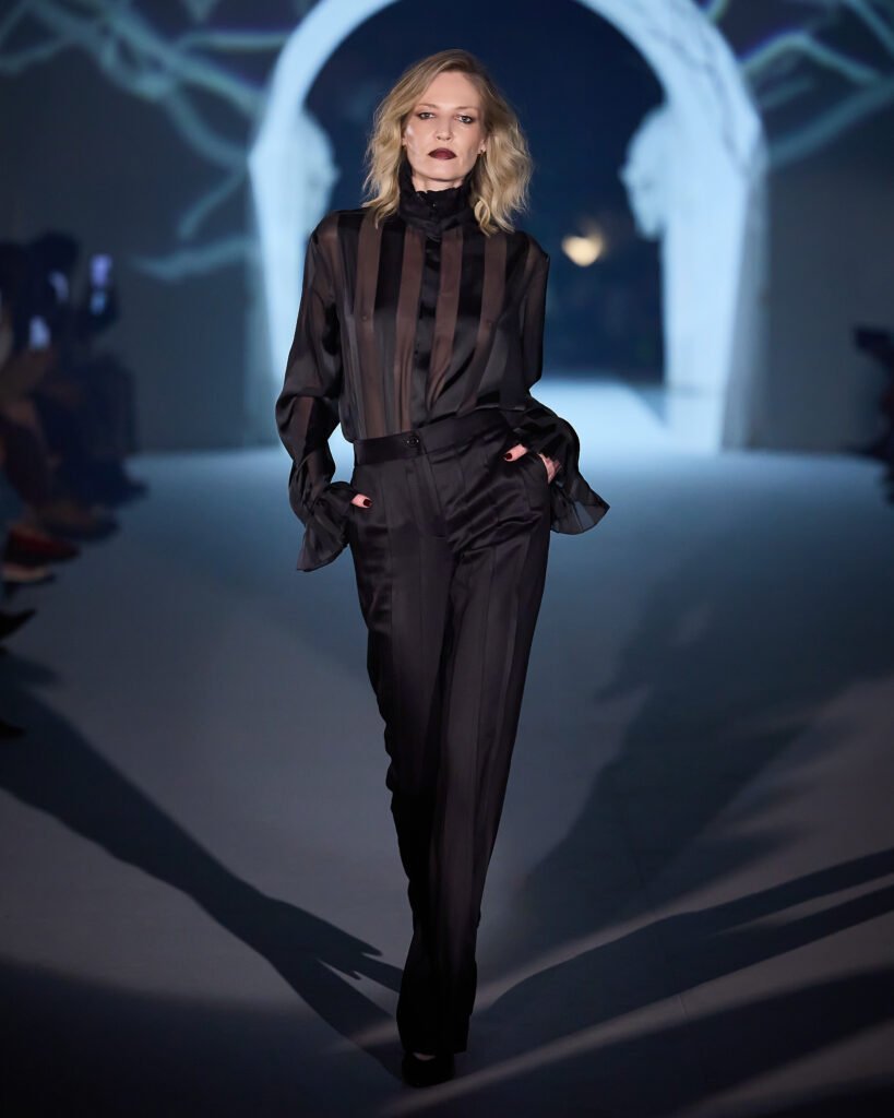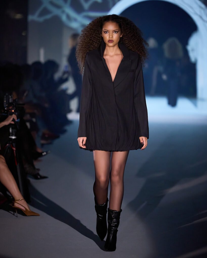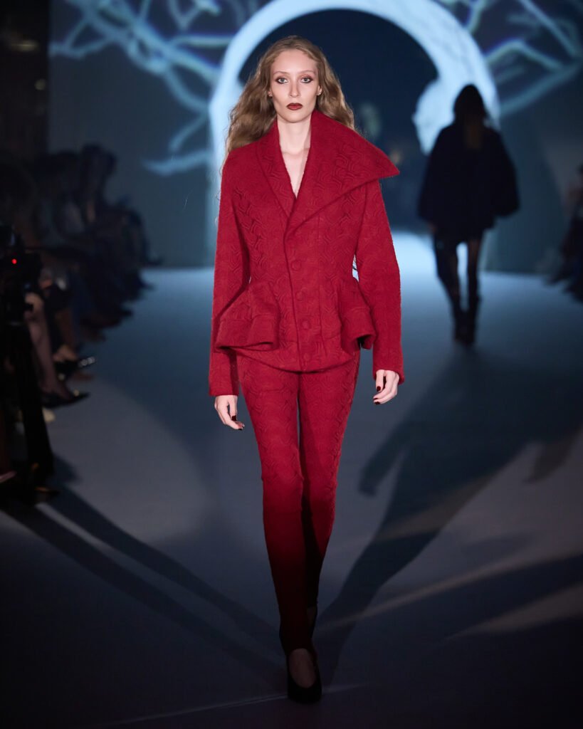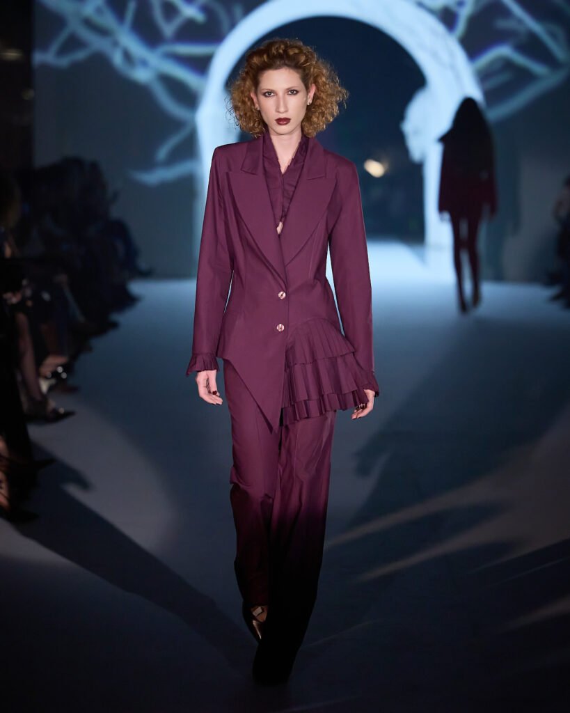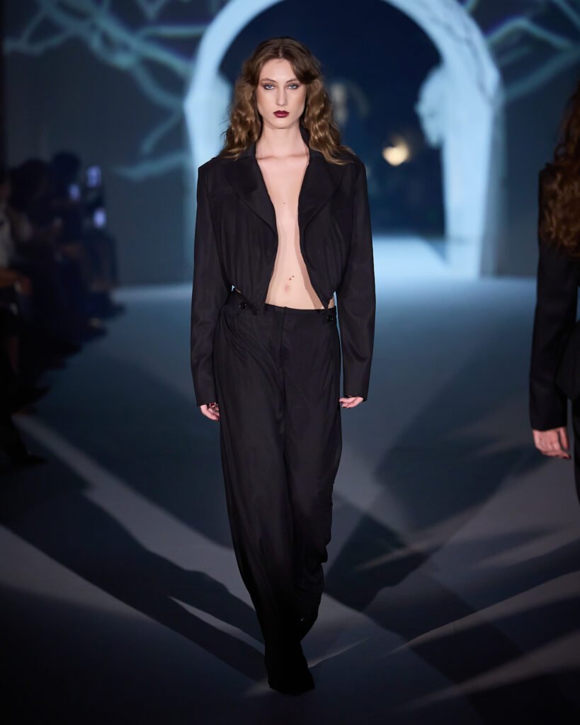 Explorando um universo de mistério, as peças foram reinterpretadas sob uma lente contemporânea, trazendo acabamentos bem definidos. A alfaiataria com bossa segue sendo a grande aposta da marca, com modelos esculturais e texturas como rendas, tules e organza, garantindo sofisticação e delicadeza, equilibrando modernidade e feminilidade. Cores marcantes como roxo escuro, preto absoluto, vinho, cinza e marrom se tornam destaque, e tecidos como crepe estruturado, bouclé trabalhado, algodão orgânico, seda pura e lã fria traduzem a elegância para a estação.O desfile seguiu a proposta expressiva e profunda da coleção conceito.
