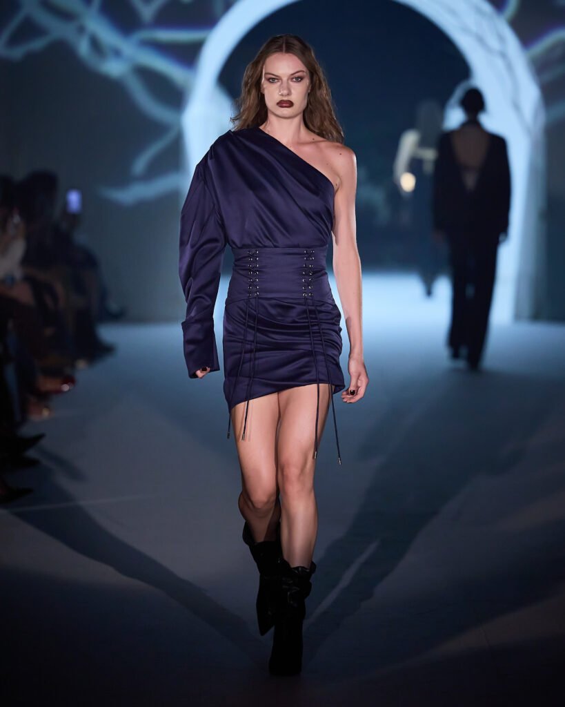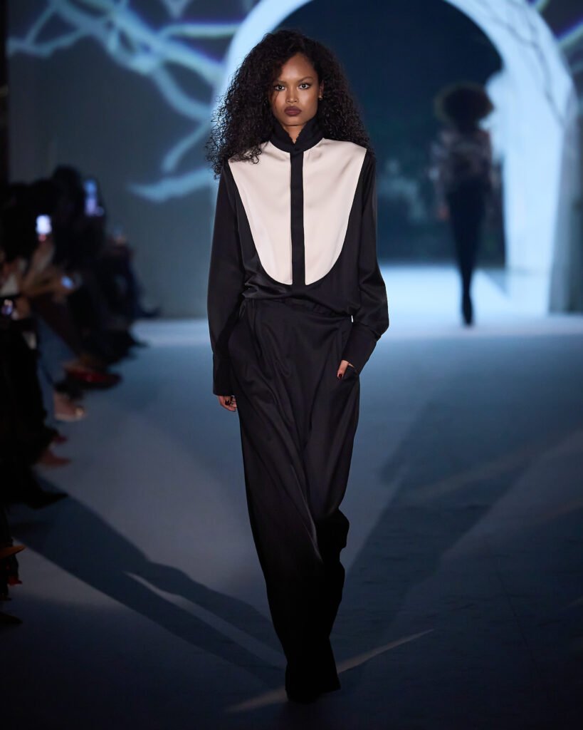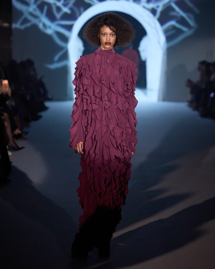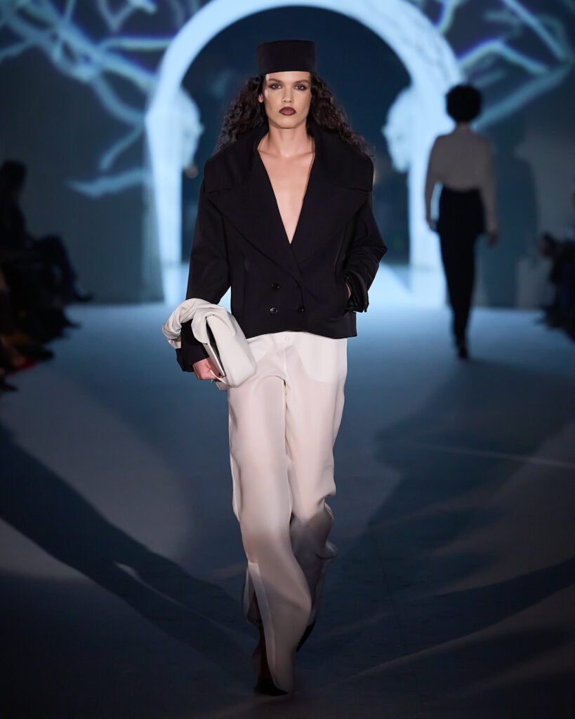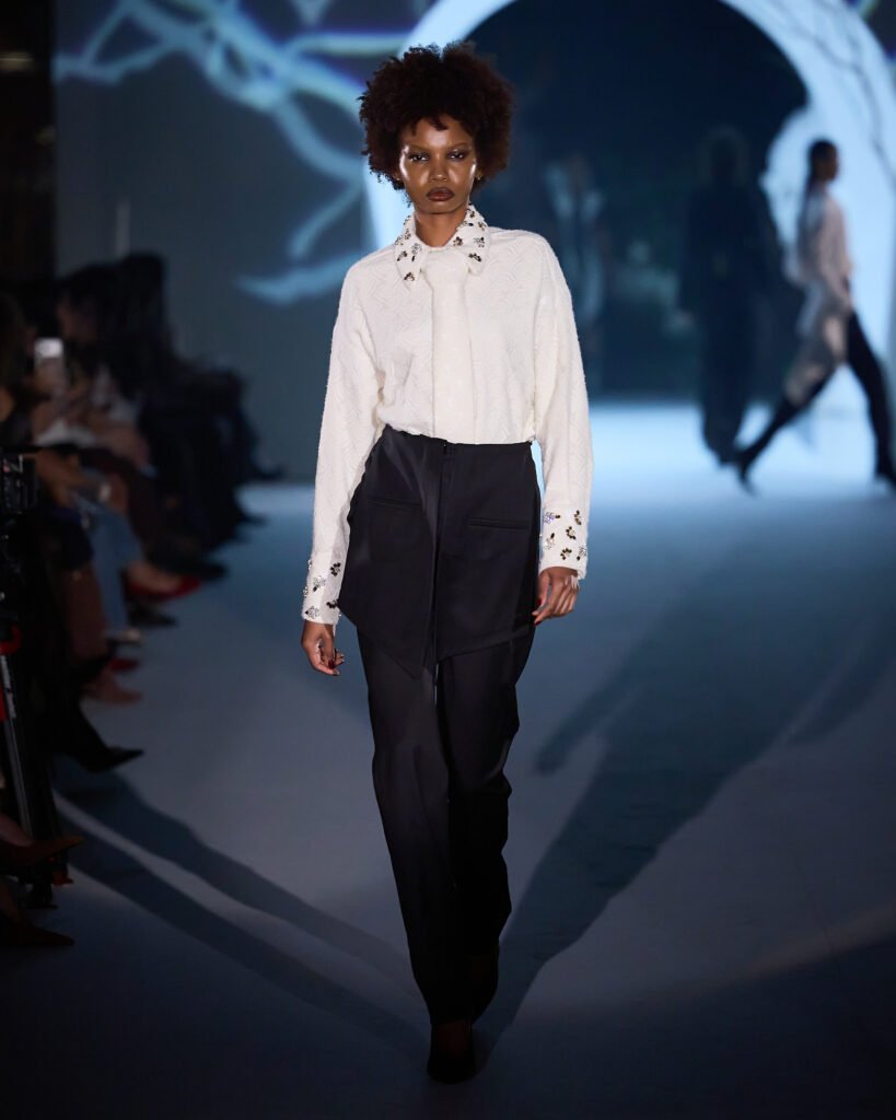 Explorando um universo de mistério, as peças foram reinterpretadas sob uma lente contemporânea, trazendo acabamentos bem definidos. A alfaiataria com bossa segue sendo a grande aposta da marca, com modelos esculturais e texturas como rendas, tules e organza, garantindo sofisticação e delicadeza, equilibrando modernidade e feminilidade. Cores marcantes como roxo escuro, preto absoluto, vinho, cinza e marrom se tornam destaque, e tecidos como crepe estruturado, bouclé trabalhado, algodão orgânico, seda pura e lã fria traduzem a elegância para a estação.O desfile seguiu a proposta expressiva e profunda da coleção conceito.