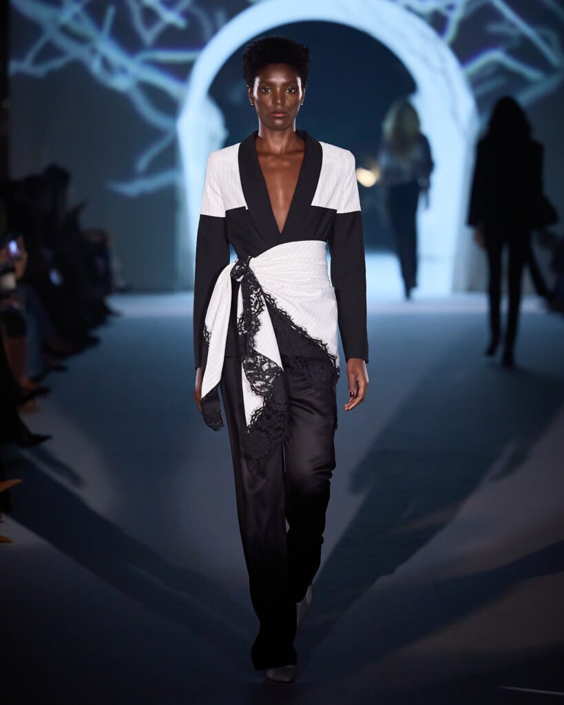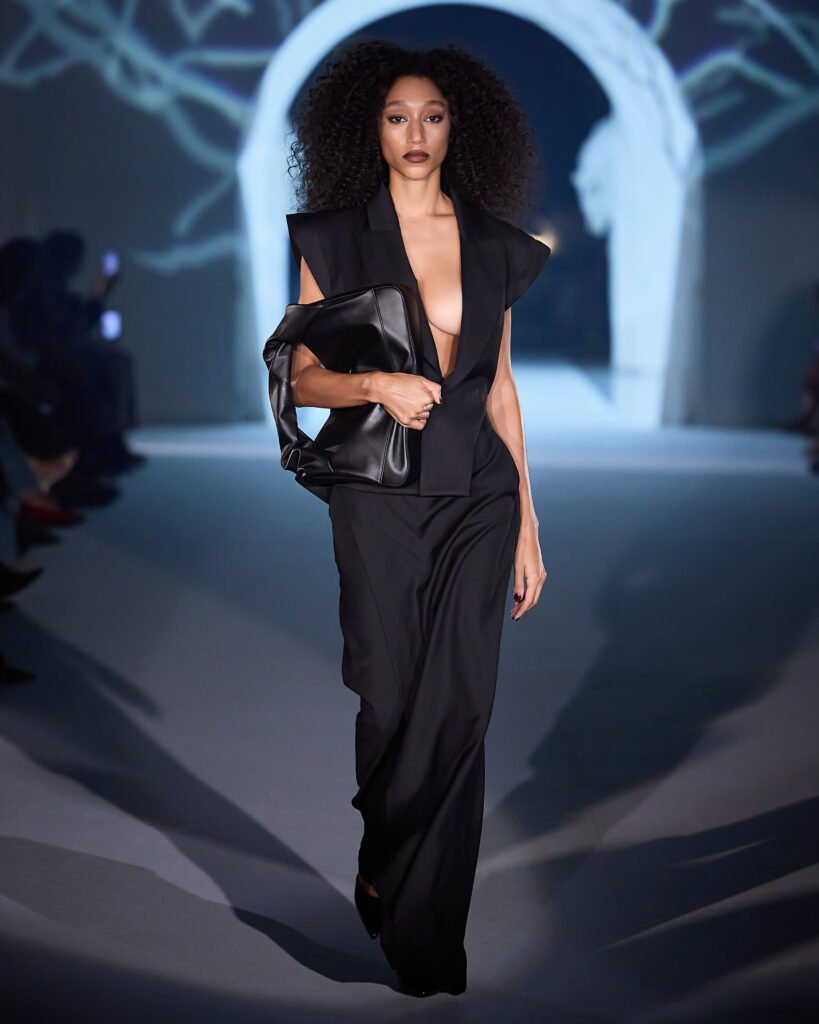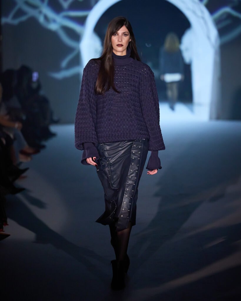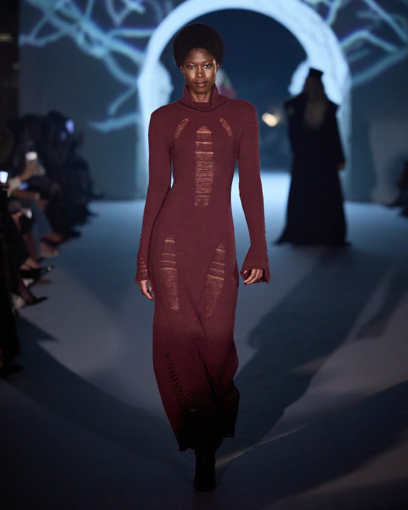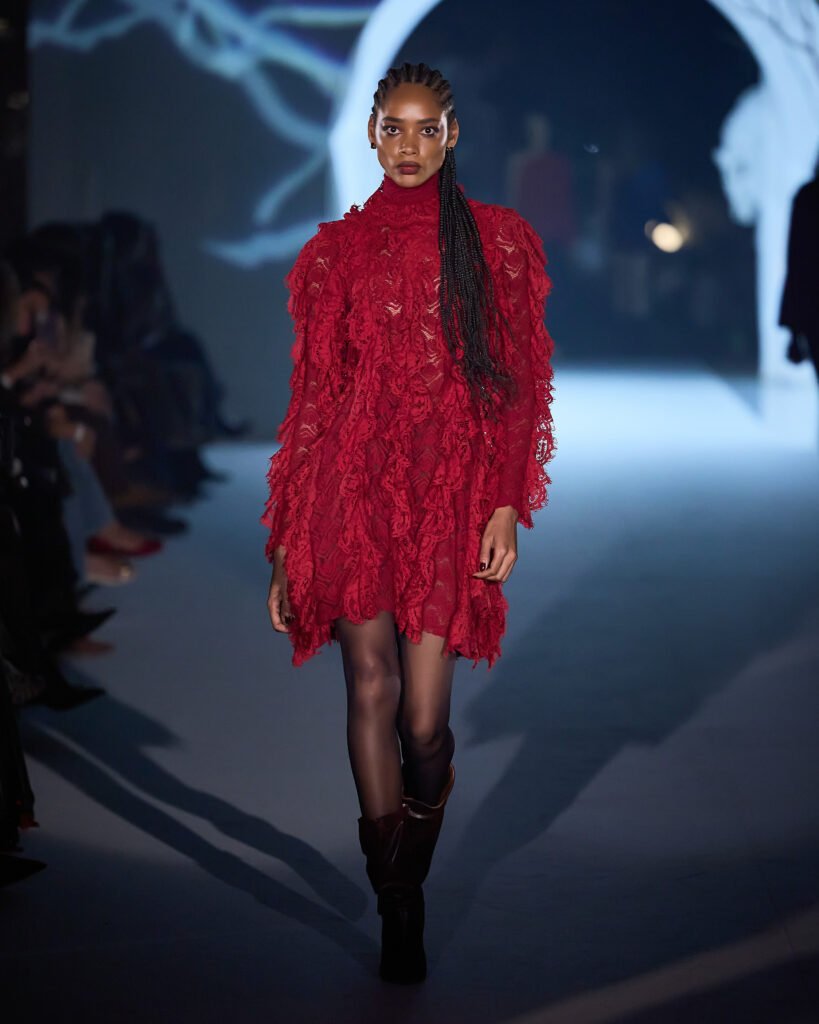 Explorando um universo de mistério, as peças foram reinterpretadas sob uma lente contemporânea, trazendo acabamentos bem definidos. A alfaiataria com bossa segue sendo a grande aposta da marca, com modelos esculturais e texturas como rendas, tules e organza, garantindo sofisticação e delicadeza, equilibrando modernidade e feminilidade. Cores marcantes como roxo escuro, preto absoluto, vinho, cinza e marrom se tornam destaque, e tecidos como crepe estruturado, bouclé trabalhado, algodão orgânico, seda pura e lã fria traduzem a elegância para a estação.O desfile seguiu a proposta expressiva e profunda da coleção conceito.