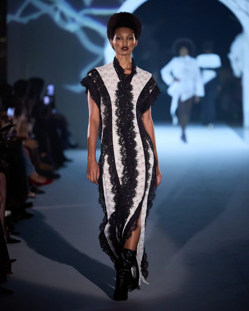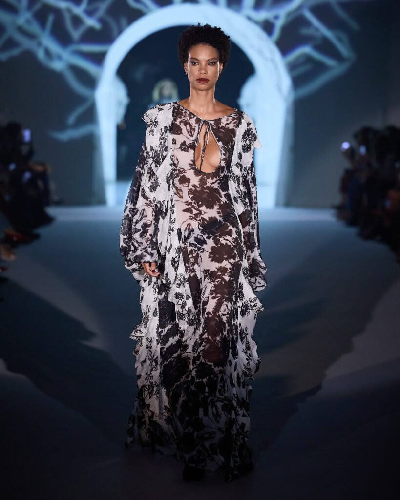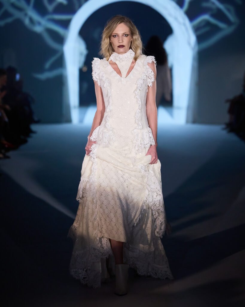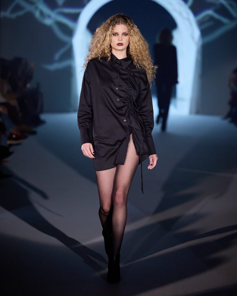 Com as peças sendo o destaque central, a passarela mostrou a transição da era gótica para a renascentista, em que a mulher passa a fugir dos ideais de pureza e submissão e passa a reivindicar sua própria liberdade, reescrevendo suas histórias a caminho da luz. Tons escuros e claros fizeram parte da construção visual, simbolizando a transformação feminina.“Rebélia fala sobre autonomia, feminilidade consciente e força estética.