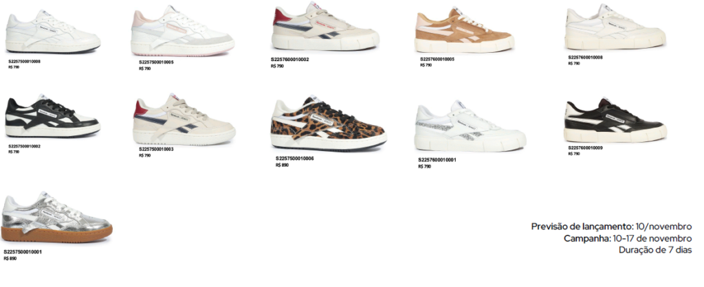 A coleção conta com 11 modelos exclusivos, tendo como base os icônicos tênis da Reebok: o clássico Club Trek e o moderno ST Club. Todos os pares trazem a assinatura Century Sync, com os calcanhares personalizados com os anos de fundação das marcas — “1895 Reebok” e “1995 Schutz” — simbolizando o encontro de um século entre os dois universos.