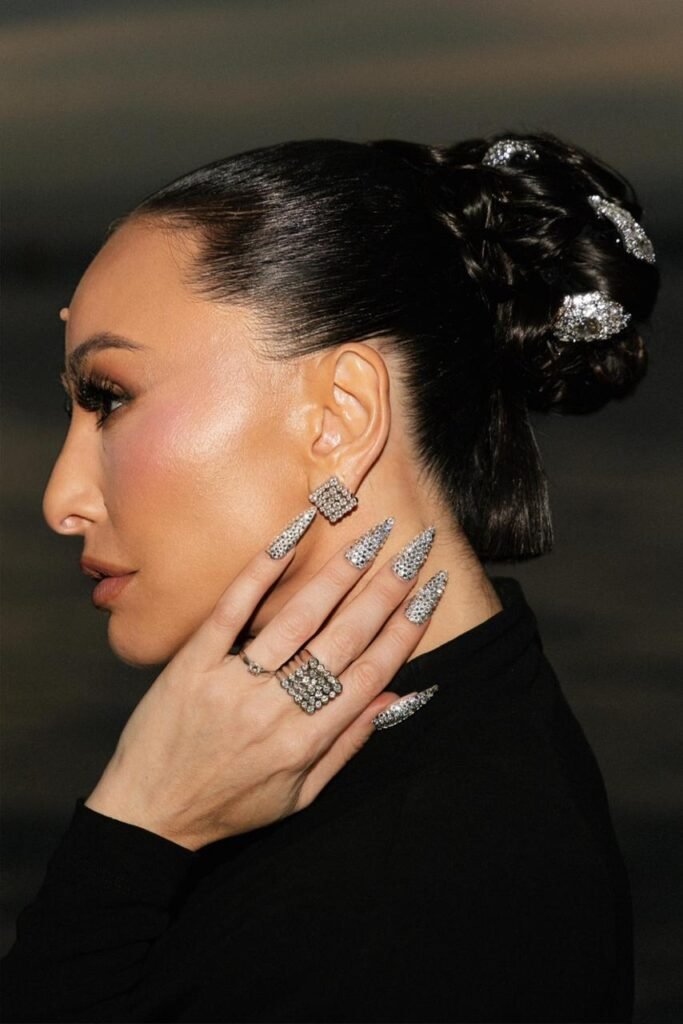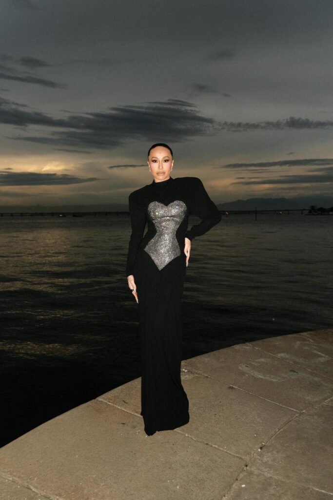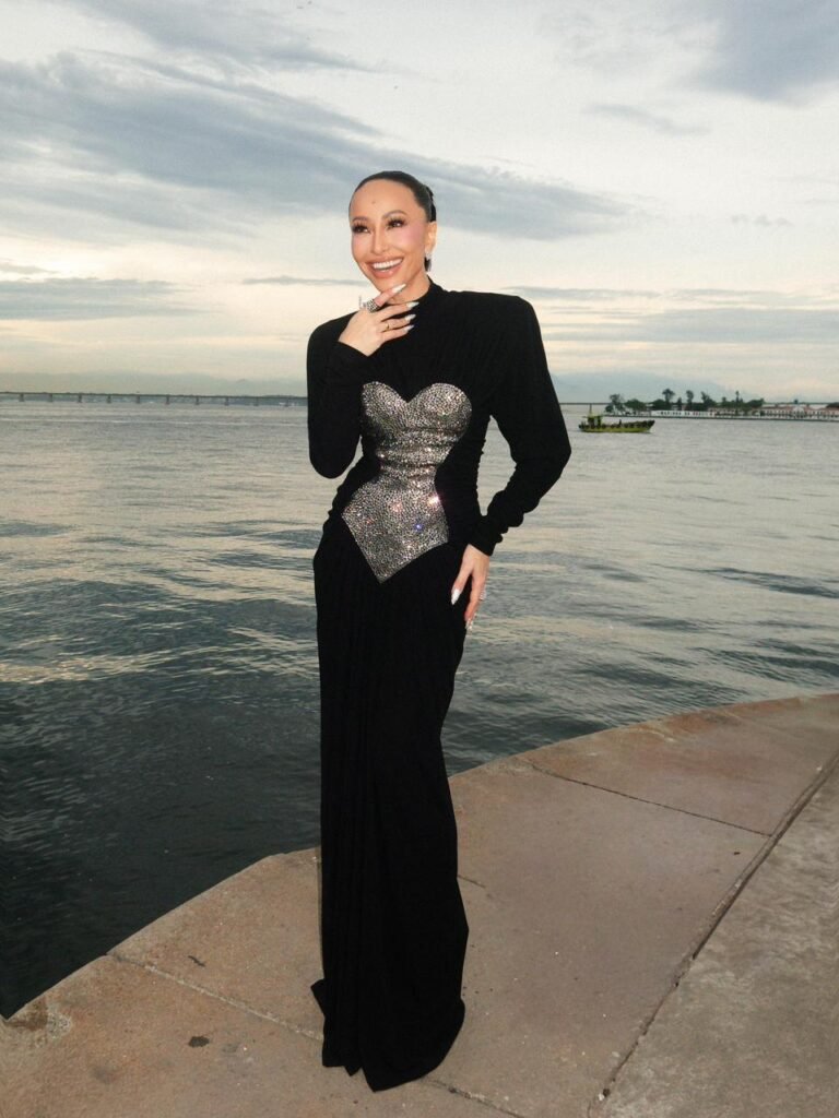 A apresentadora apostou em um look poderoso da estilista Stella McCartney, da nova coleção Ready-To-Wear. O macacão preto, de design escultural, combinava ombros estruturados inspirados nos anos 1980 com um painel frontal em formato de corset coberto por pedrarias reluzentes.