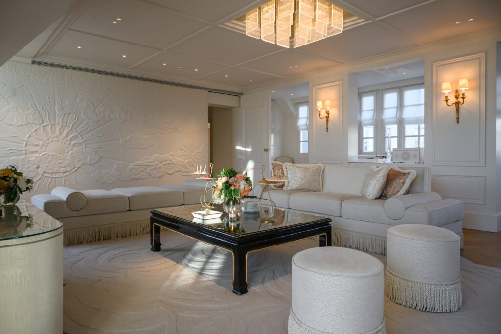 As suítes do Le Bristol são um capítulo à parte. A Honeymoon Suite, localizada no último andar, oferece vista panorâmica de Paris, incluindo a Torre Eiffel. O ambiente, assinado pelo artista Dimitri Rybaltchenko, é uma ode à arte e ao amor: um baixo-relevo de seis metros e 400 quilos domina o espaço, acompanhado por uma escultura aérea em vidro soprado que paira sobre sofás brancos e tapetes em forma de nuvem.