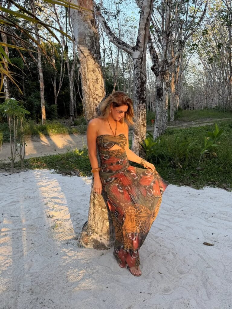 Didi surge com um vestido fluido e estampado da Trya, traduzindo a força do boho orgânico que retorna repaginado. A modelagem leve, a estampa inspirada na natureza e a cartela terrosa dialogam com um verão mais sensorial e conectado ao ambiente. É a tendência do easy chic, perfeita para transitar do dia ao pôr do sol com elegância despretensiosa.