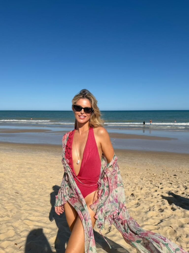 Em São Miguel Arcanjo, a influenciadora optou por biquini tie dye com saída fluida que reforça a tendência da sensualidade elegante: linhas limpas, decote marcante e sobreposição etérea que alonga e dá drama sem pesar. Em 2026, o beachwear caminha para esse lugar de “poucas peças, muito impacto”, com clima de sofisticado e solar ao mesmo tempo.