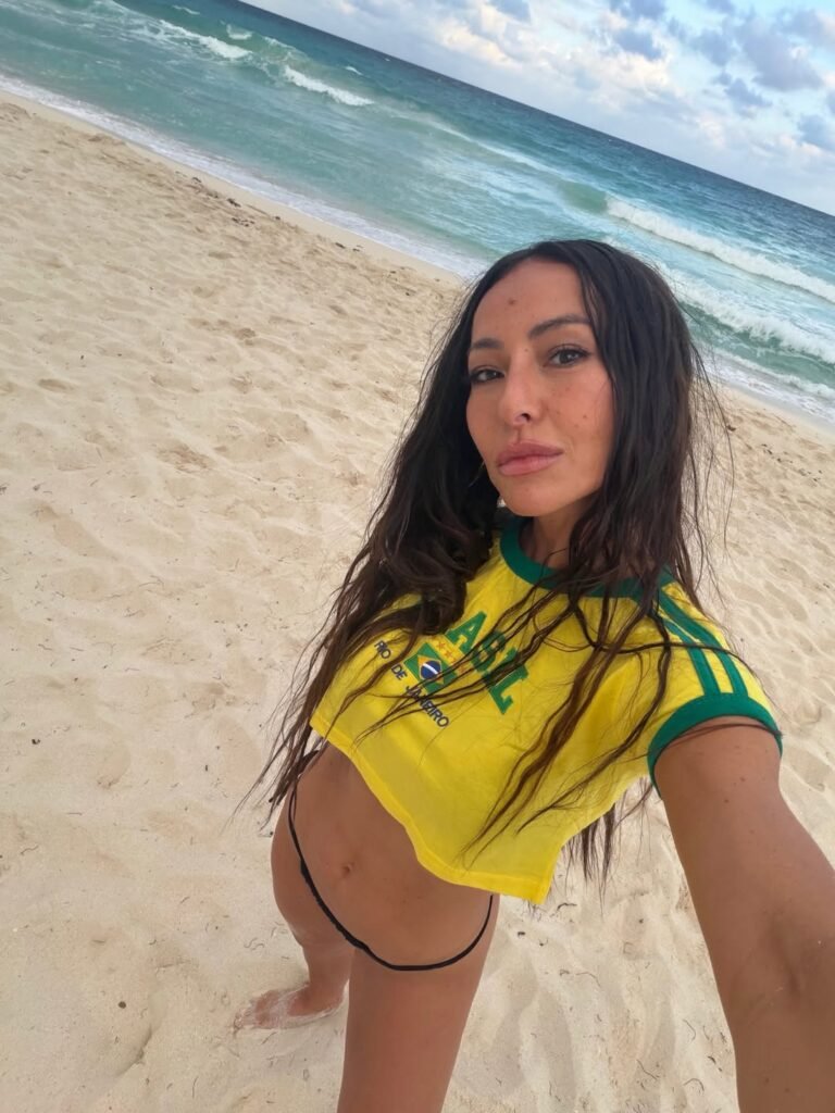 Livia aposta no handmade statement com um biquíni de crochê escultural da Andi Bagus. A peça reforça uma das principais apostas do verão 2026: o artesanato elevado, com acabamentos elaborados, argolas, franjas e design quase joalheiro. O beachwear deixa de ser básico e assume protagonismo fashion, funcionando tanto na praia quanto em produções resort mais ousadas.