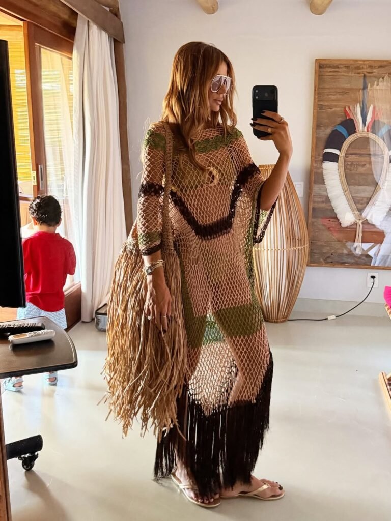 Em Trancoso, Thássia Naves traduz com precisão uma das grandes apostas do verão 2026: o artesanato sensorial em versão resort deluxe. O vestido de tramas abertas da Casa Aika, com franjas longas e jogo de transparências, reforça a força do handmade sofisticado, que une técnica manual, estética boho e apelo contemporâneo.